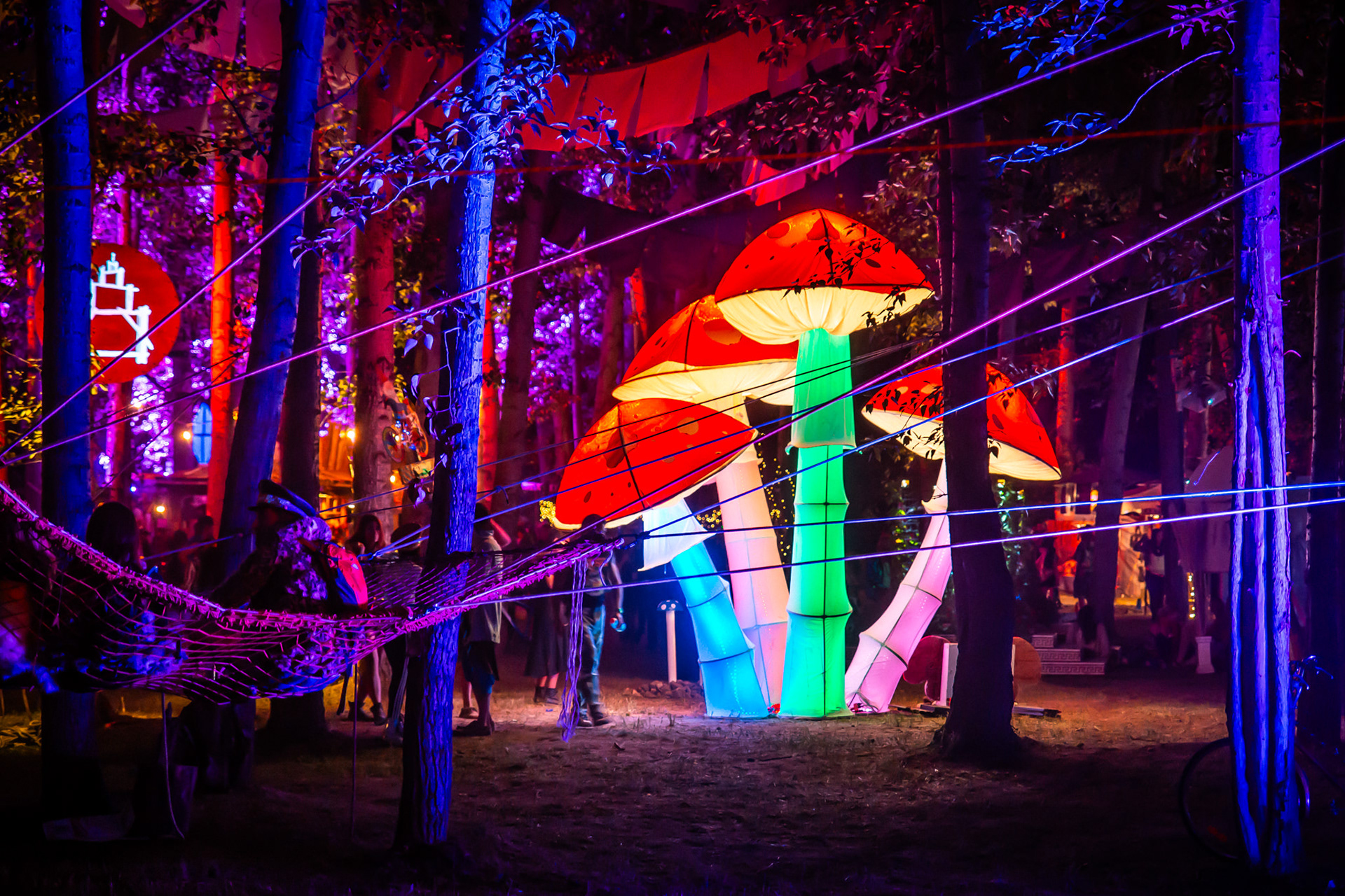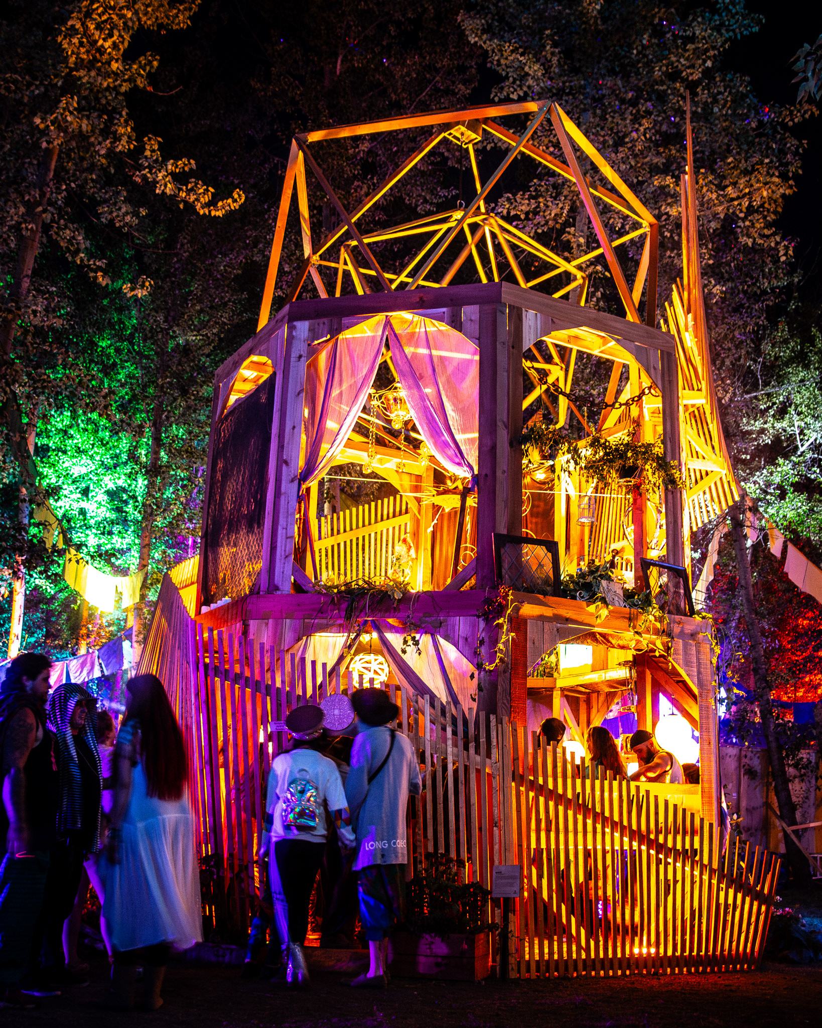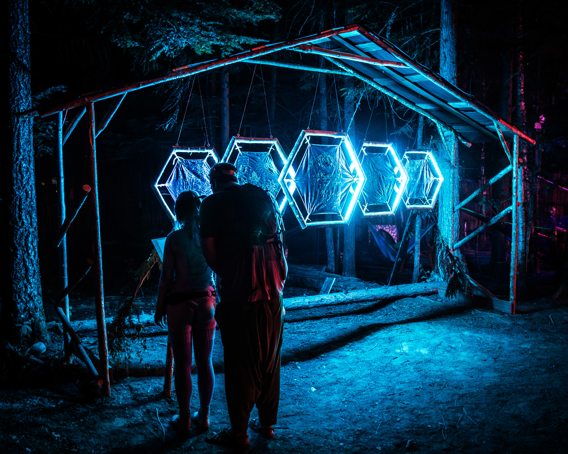 Photography of immersive art installations, festival sculptures, projection mapping, and interactive art experiences at music festivals and nightlife events.